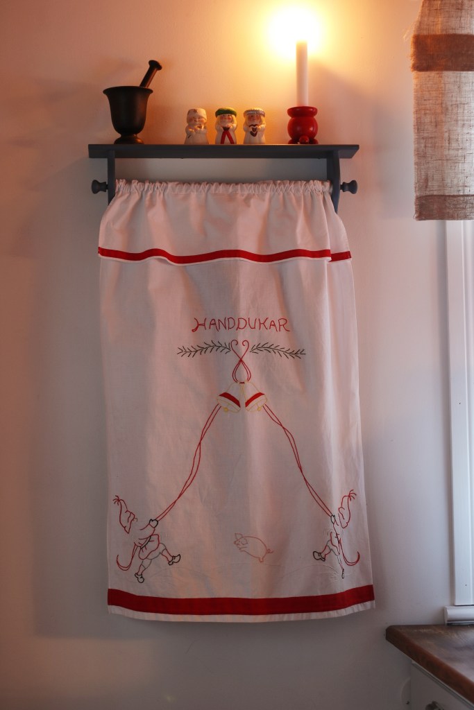 En av mina absoluta favoritpynt hemma är min paradhängare, även när det inte är jul. Men jag blev extra lycklig över att hitta en så fin julig paradhandduk. Så nu lyser den upp fint i köket, med både klockor och tomtar. Broderingen är fantastiskt fint gjord.