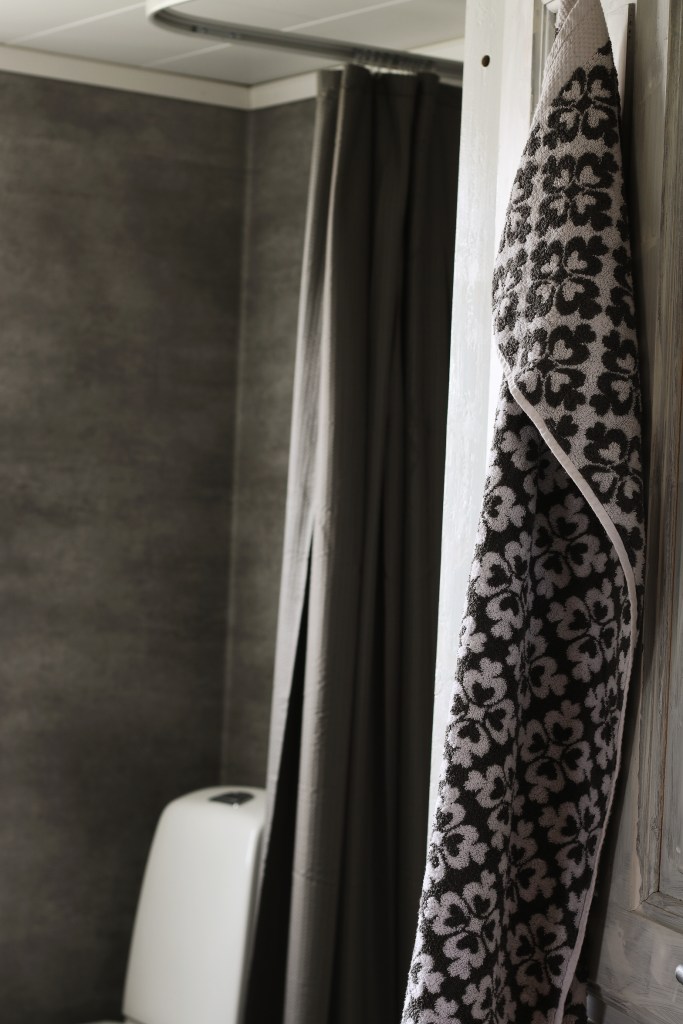 Badrummet är det rum som är mest ”modernt” i huset och även om jag inte skulle valt denna stil till alla badrum, så tycker jag det passar perfekt här. Badrummet är i kvadratmeter så pass litet att jag ville ha ett mörkt och mysigt badrum. De mörka mattorna är också till för att duschen inte ska bli så gul direkt, vilket är en tråkig del med vårt egna vatten som färgar mattor och kakel överallt.