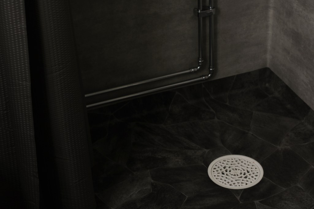 Här syns mattorna lite bättre. Mörka ”stenar” på golvet, som varierar grått till nästintill svart, och så en ljusare flammigt grå matta på väggarna. För mig var valet självklart på dessa två när jag gick genom det urval vi fick från mattläggaren, och med blanka rör till!