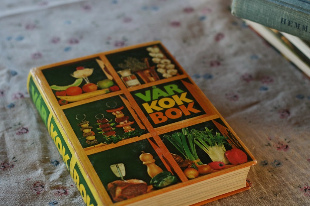 Jag har länge letat efter en lite äldre upplaga av klassiken Vår kokbok, då jag tycker det är bland de bästa baskokböckerna som finns. Dock tycker jag inte riktig om hur de nya upplagorna har framförallt recept på ”modernare” mat, så jag köpte denna 70-tals gula upplagan från 1975