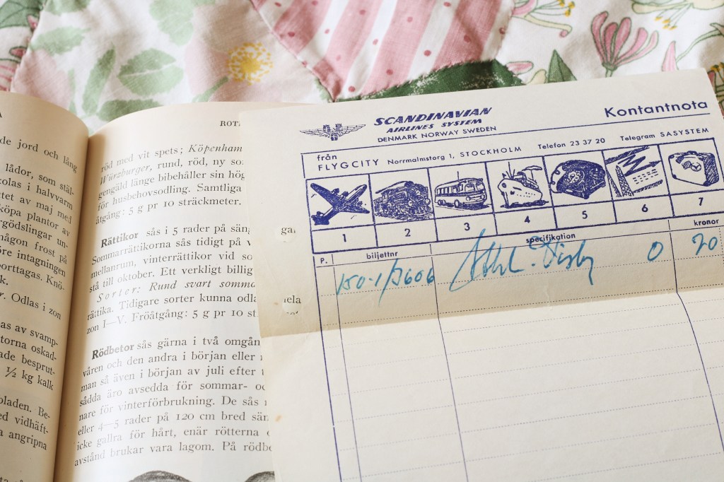 Tydligen har han även haft med sig boken på resa, för som bokmärke i den låg denna flygbiljett. Farfar har flugit till Visby, Gotland med SAS i April 1954 och fick betala 20 kr kontant. Längre ner på den har han även fått skriva under. Ett riktigt tidsdokument.