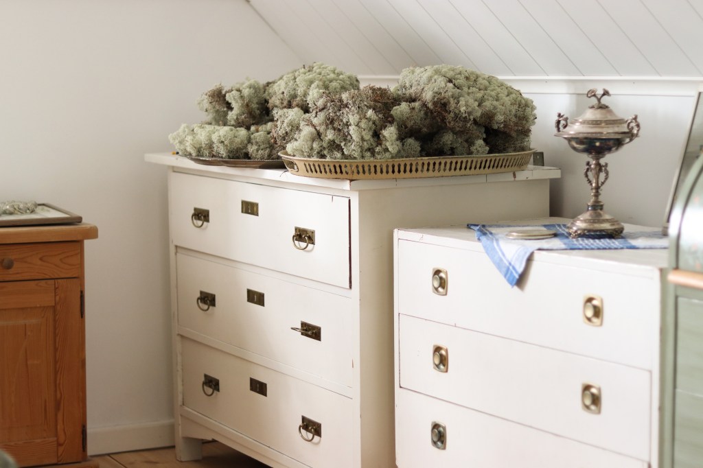 Så här såg det ut i detta hörnet innan. Dessa byråer är ju egentligen mycket vackrare, men den stora är bara på lån från min pappa, så vi behövde hitta något eget, och som dessutom maximerade utrymmet i och med att förvaringen i Lilla stugan i i närheten av noll. Så den höga har fått flytta in till pappa igen för att få bli den spegelbyrå den i vanliga fall är, och den lilla har fått blivit förvaring i hallen istället.