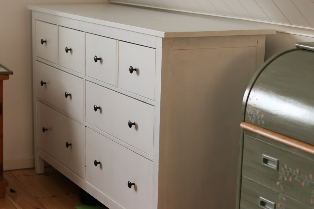 Förra helgen dök jag på ett byrå på market place som jag väntat på i ett år, ända sedan vi flyttade in. Det är inget speciellt med den egentligen, en vanlig IKEA, men de är nästan omöjliga att dyka på och hinna köpa innan någon annan. Vi har en likadan fast med 6 lådor på andra sidan sovrummet, och har väntat på en till. Nu fann jag den, för en femhundring dessutom. Den var svart när vi hämtade den, men det var ju enkelt löst!