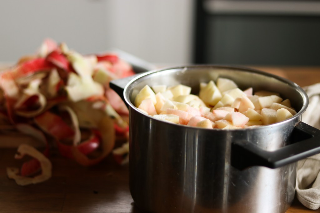 Jag började med att skala, kärna ur och hacka små bitar av våra äpplen. Jag tog en sort som blir mosig, men vilka äpplen som helst fungerar. Sedan slog jag på lite vatten och lät det hela koka tills det inte fanns någon konsistens kvar på äpplena alls. Körde över det hela med stavmixern också för att få bort det sista bitarna.