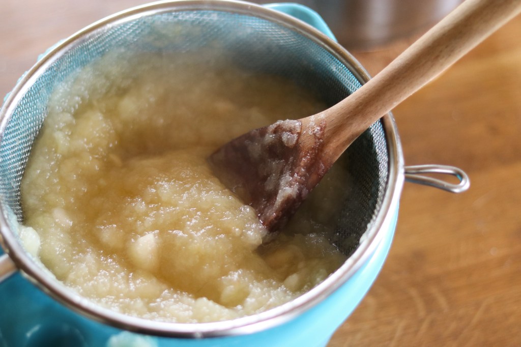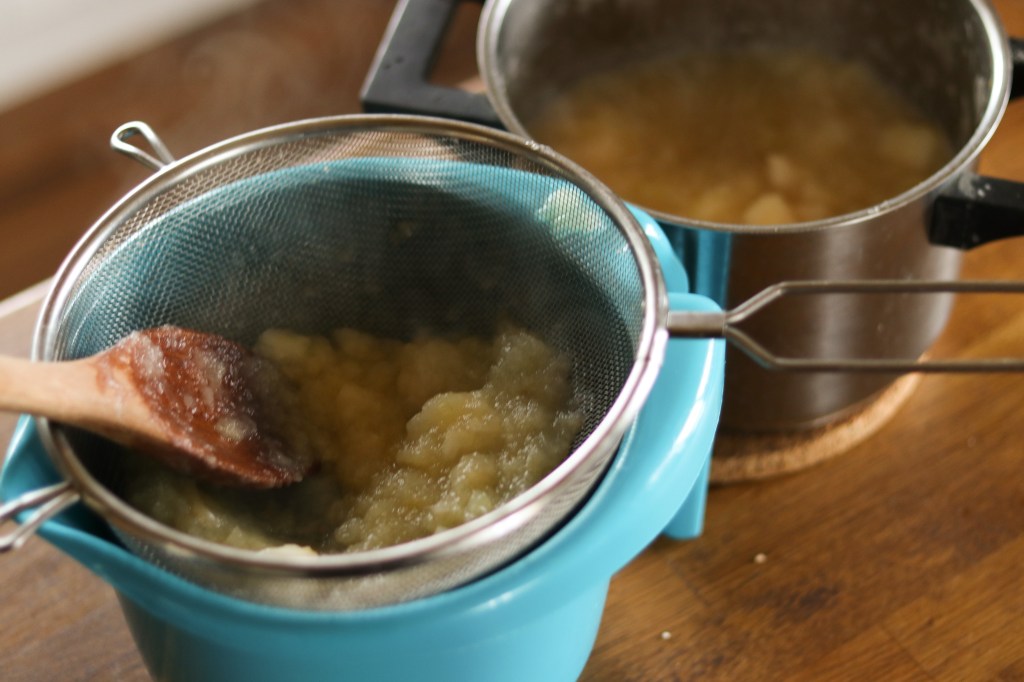 I och med att det är så viktigt att det är finfördelat när de gäller småttingarna, så pressade jag även äppelmoset genom en sil. Häller upp en klick i silen och vispar runt tills det går genom hålen.