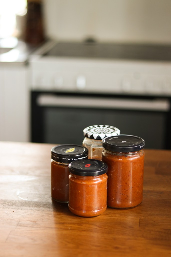 Jag använder vanliga glasburkar med plåtlock, och för att kunna förvara dem en lång tid konserverar jag även burkarna i vattenbad.