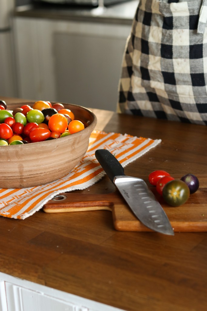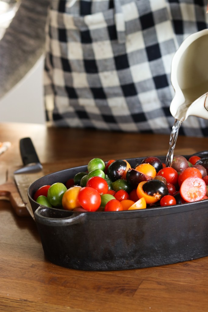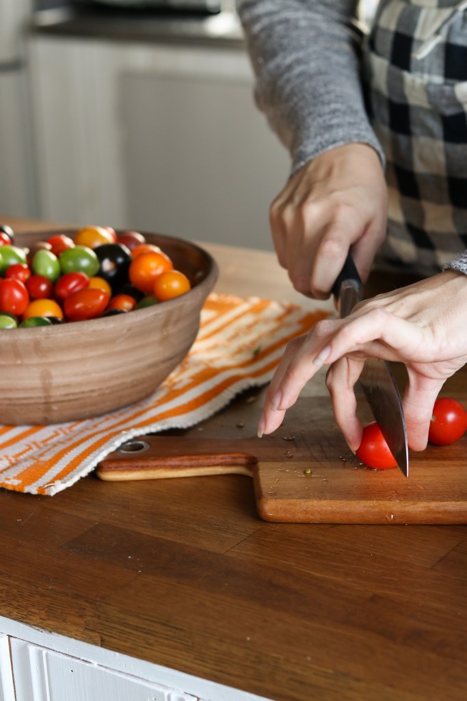 De minsta tomaterna slänger jag bara i grytan, men de lite större delar jag i klyftor för att de ska koka sönder fortare. De behöver inte skalas eller något, utan hela tomaten får följa med.