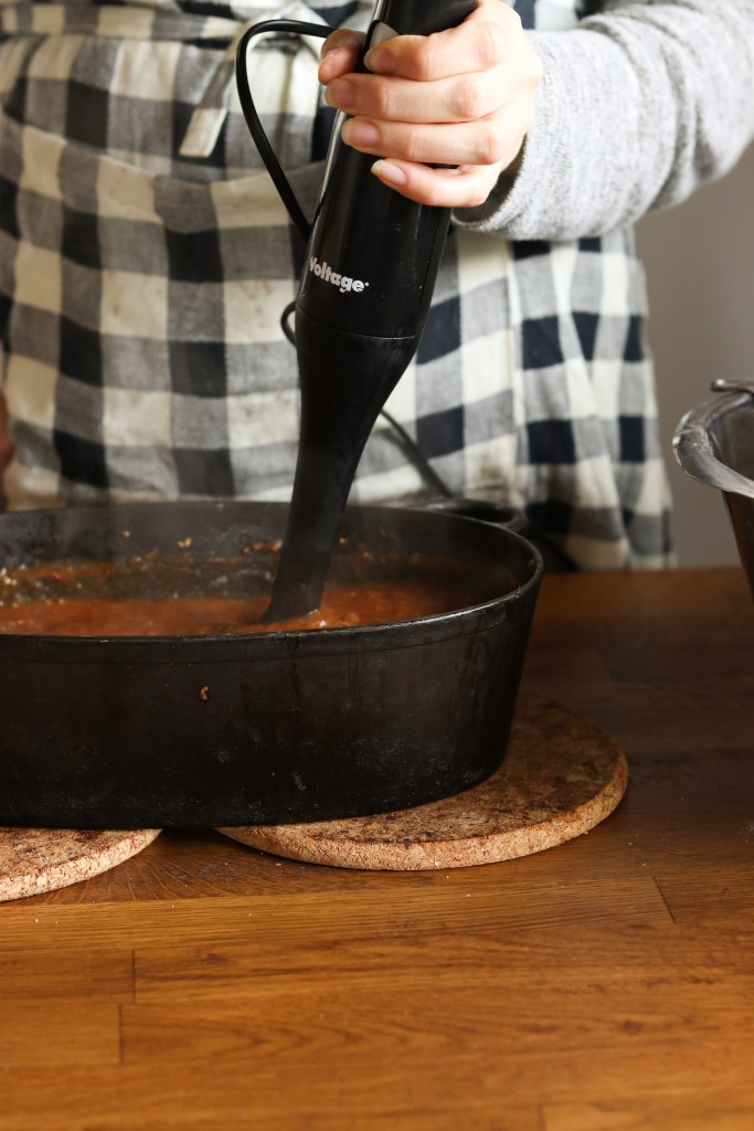 När tomaterna kokat klart kör jag över dem ordentligt med en stavmixer för att finfördela röran tills alla stora delar är borta.