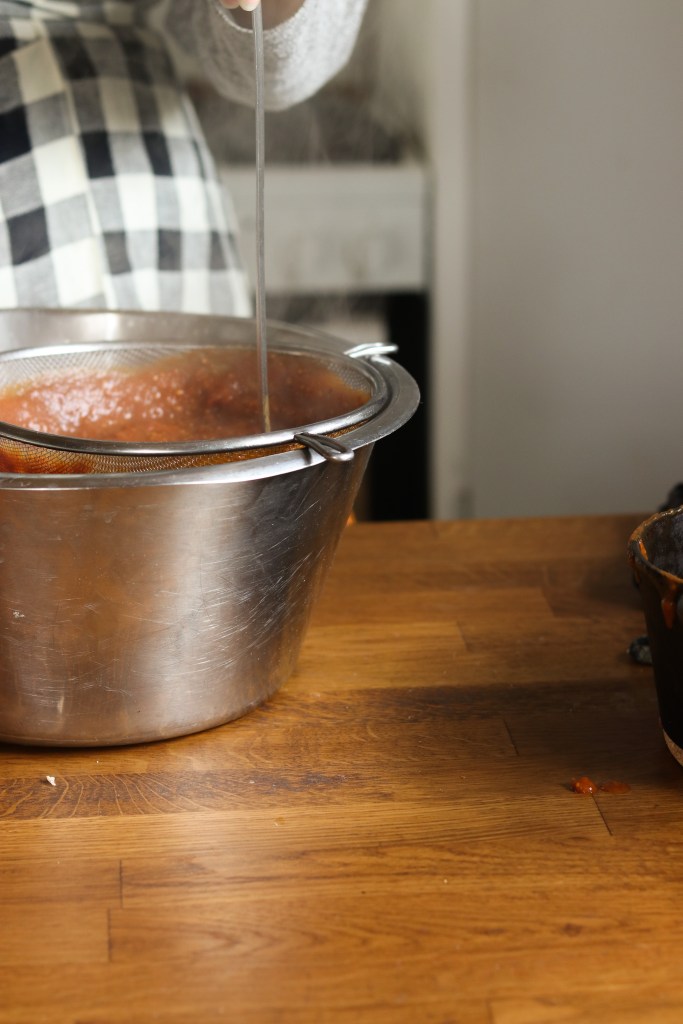 Då slår jag över det hela i en sil och pressar såsen genom de små hålen. Enklast med en träslev eller en hålslev som jag använder. Men en passervagga är annars toppen om man har en sådan i sina förråd. Men med silen vispar jag runt tills det egentligen bara är frö kvar i silen. Såsen är nu helt slät och redo att förpackas.