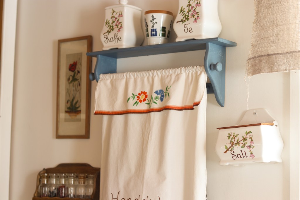 Ny förvaring för kaffe och te, tillsammans med härliga textilier och blommor.