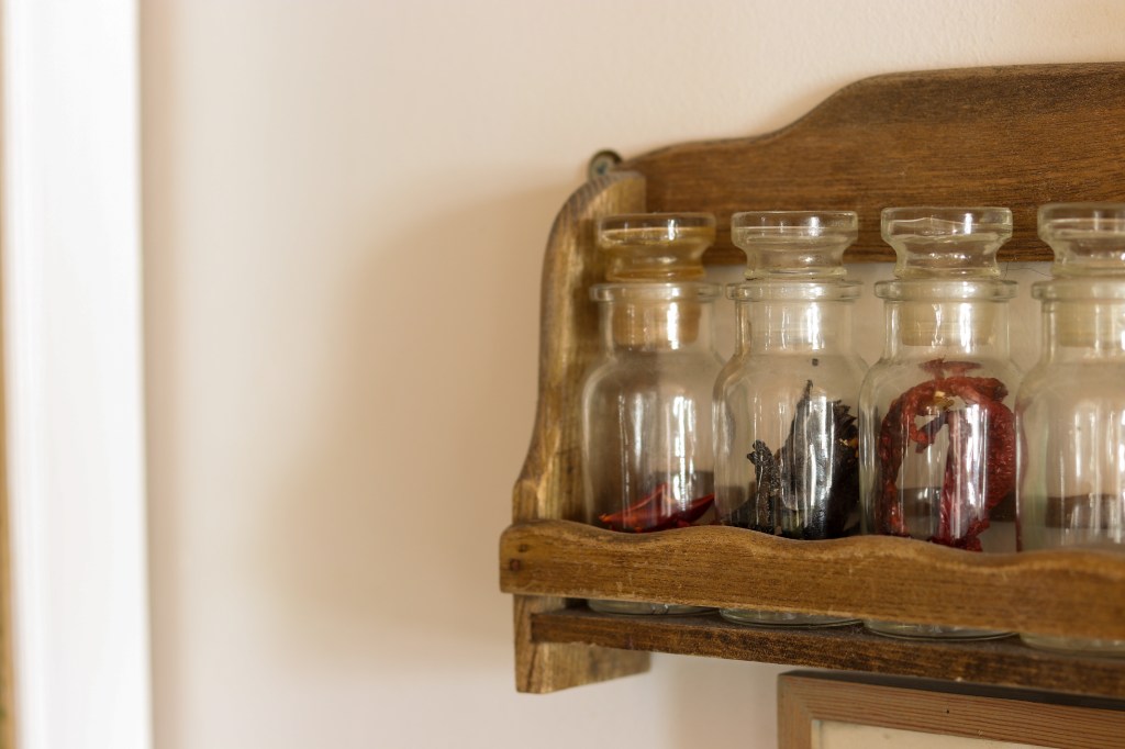Hemodlad chili i en loppad hylla med glasflaskor.