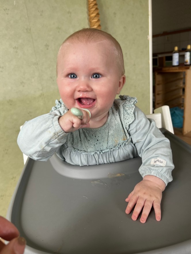 Utvecklingsmässigt är flisan en ståtlig tjej som snart är 70 centimeter lång, och vägde 9210 gram senast. Hon är högst upp på alla kurvor hos BVC, och fick epitetet ”den starkaste bebis jag någonsin mött” av läkaren på sexmånadersinspektionen. Hon har nu storlek 74 i kläder, även om 68-favoriterna kan fortsätta användas, de är bara lite korta i rocken så att säga. Vaggan hon sovit har nu blivit för kort, och spjälsängen har introduceras, så nu sover hon sitt eget rum. Denna förändring gjordes för bara några dagar sedan, och det värker och oroas fortfarande lite i mammahjärtat här.