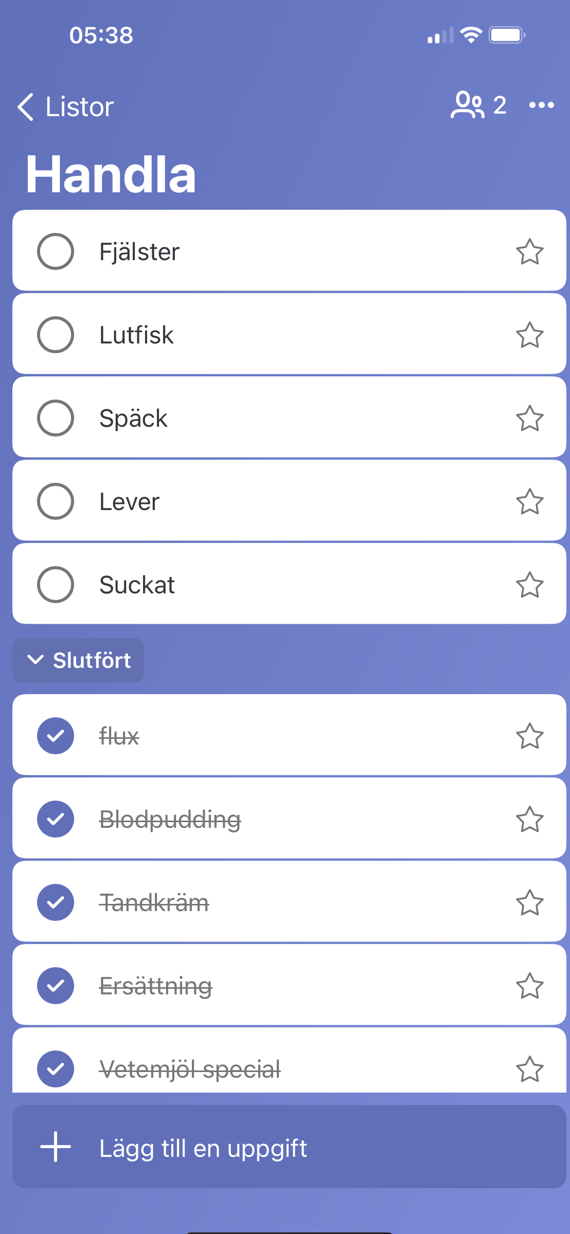 Jag och Albin gör inhandlingslistor digitalt i mobilen, för att alltid ha dem med oss. Vi använder appen Microsoft to do, väldigt enkel app men med finessen att man kan dela listor med varandra. Så vi har en delad lista ”Handla” för allting vi behöver köpa, så vet båda två vad som bör komma i vagnen för den som tidigast är i närheten av en butik. Oftast fungerar det så att vi under tiden mellan handlingar så fort vi tar slut på någonting, skriver upp det på listan, för att inte glömma bort det. Närmare handling så fylls den på undan för undan.