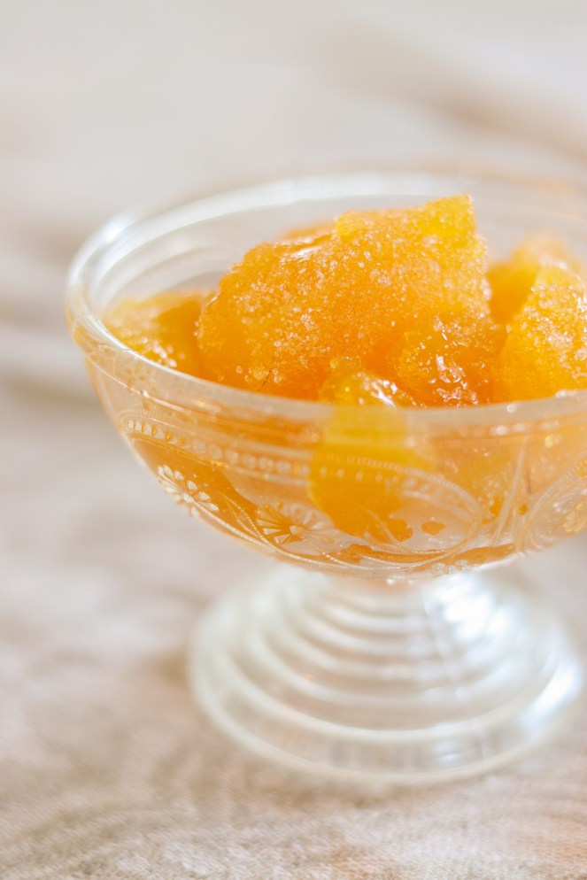 Täck en mindre form med aluminumfolie. Blanda alla ingredienser utom pektinet i en kastrull och koka upp blandningen under uppkörning. Låt det koka 1 minut. Ta av kastrullen och rör ner pektinet. Häll smeten i formen och låt stelna i rumstemperatur i ca 1-2 dagar. Stjälp upp gelén och låt den torka på undersidan, innan du skär det i bitar och låt dem ligga i ett dygn till och torka. Rulla sedan i strösocker precis före servering.