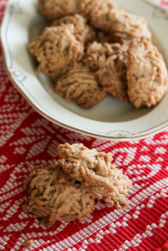 Sätt ugnen på 175 grader. Blanda samman alla ingredienser till en deg, som sedan får vila en stund i kylskåp (ca 1 timme). Dela degen i små bitar, och pressa genom en vitlökspress, eller som jag, en potatispress. Fördela den pressade delarna till lagom stora kakor på ett bakplåtspapper. Grädda tills gyllenbruna, ca 10-15 minuter beroende på storlek.
