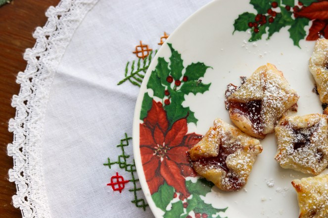 Julstjärnor är en god, och inte för söt, julig kaka som är snabbgjord och vacker. En variant på den finska julstjärnan som mer liknar mördeg och fylls med plommonsylt. Här får du istället en snabbare variant där du kan välja valfri sylt ur skafferiet till fyllning. Antingen gör du dem fullstora och viker dem som vindsnurror, eller små minivarianter som jag gjort här som bara blev som små paket.